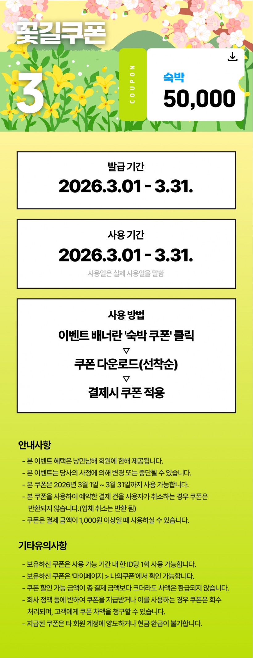✔️ 사용방법: 낭만 남해 접속 -회원가입 및 로그인- 이벤트 배너 ‘숙박쿠폰’ 클릭- 쿠폰 다운로드- 결제시 쿠폰 적용